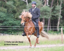 Boven aan bij de zesjarige hengsten eindigde vos met bles Týr frá Nýttland (V: Bragi frá Austurkoti ) van fokkers Arjen Heerema, Sjaak Smeeing. Týr is in eigendom van de combinatie Smeeing/Donderwinkel/Heerema. Týr werd voorgebracht door Erik Spee en scoorde op exterieur op alle onderdelen een 8 of hoger. De jury noteerde een 9 voor zijn uitdrukkingsvolle hoofd, goed geplaatste oren, goed geopende ogen en goede gewrichten (ext 8,31). Ook onder het zadel viel Týr op door zijn goede hoofdhouding met een goede oprichting. Zijn snelle galop was bergopwaarts (8,5), maar helaas bleven draf en stap wat achter. Voor verrichtingen scoorde Týr een 7,94. De totaal score was 8,09, daarmee heeft Týr de WK norm voor Berlijn behaald. Gefeliciteerd fokkers/eigenaren. Als er geen merrie in deze leeftijdsklasse is die de WK-norm haalt dan kan er naast Maximus eventueel een tweede hengst mee. Tijdens de prijsuitreiking op zondagmiddag nam Eric Spee namens de eigenaren een NSIJP deken in ontvangst. Voor een deken komen in aanmerking Nederlands gefokte paarden gekeurd op een Nederlandse keuring in eigendom van een NSIJPlid, en gekeurd met een eindscore van 8 of hoger.